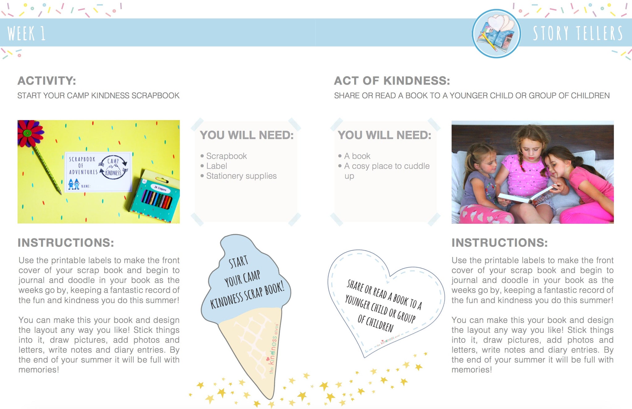 - Labels, lists, scavenger hunt and Camp Kindness completion certificate to print